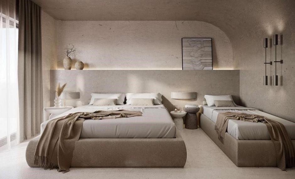 Two spacious beds with plush pillows and high-quality linens ensure a comfortable night’s sleep, while ambient lighting and minimalist furniture create a sophisticated sense of space. Decorative vases, wall art, and subtle textures add a touch of character without overwhelming the room’s serene feel.
